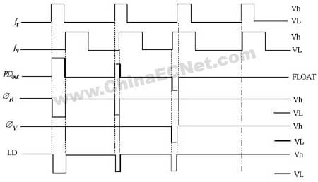 R(3脚) 和 V(4脚)是片内鉴相器的两路输出,当 R和 V同频同相时,各自输出高电平,并带有窄脉冲(如图2 (C7为低电平)所示,当C7位高电平,R和V图形互换)